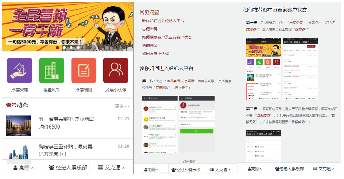 客戶(hù)注冊:擁有微信并關(guān)注公眾號,即可注冊申請成為全民營(yíng)銷(xiāo)系統的用戶(hù)(全民經(jīng)紀人)。注冊用戶(hù)可隨時(shí)通過(guò)微信查看已經(jīng)推薦的客戶(hù)信息、購房進(jìn)度、傭金結算情況。